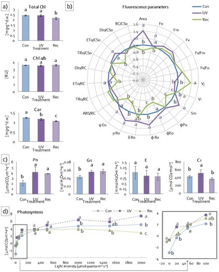 To verify the photosynthesis efficiency of examined plants, gas exchange was measured using infrared. These measurements enabled the determination of actual photosynthesis efficiency (Pn) (at 100 μmol quanta·m−2·s−1), stomatal conductance (Gs), transpiration (E) and intercellular CO2 concentration (Ci). Net photosynthesis increased both in UV and recovery plants compared to control (Figure 3c). An increase in Gs was also noted in UV and recovery plants relative to the control (Figure 3c). Transpiration did not change in both UV and recovery plants relative to the control (Figure 3c), whereas Ci increased in UV plants compared to control and recovery plants (Figure 3c). In addition, in low light intensity (0–50 μmol·m−2·s−1) and in the range of light intensity between moderate (100 μmol quanta m−2·s−1) and high (2000 μmol quanta·m−2·s−1), leaf photosynthesis efficiency of UV plants was significantly higher than in control and recovery plants (Figure 3d), while the leaf photosynthesis efficiency of recovery plants did not change in relation to control in low and moderate light intensity (0–1000 μmol quanta m−2·s−1) but decreased in high light intensity (2000 μmol quanta·m−2·s−1) (Figure 3d).