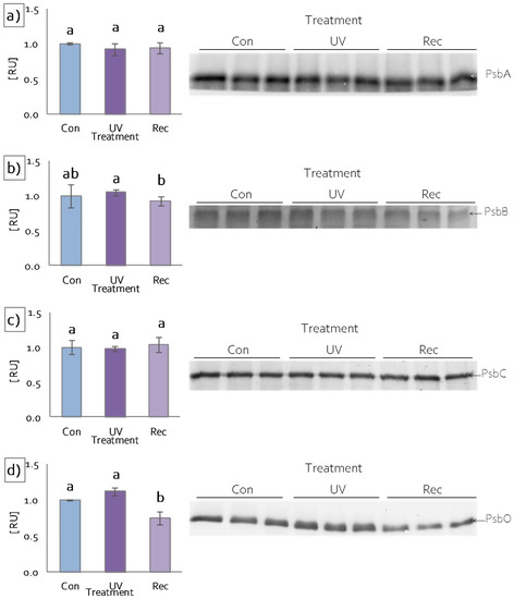 Response of D. muscipula photosynthetic apparatus to UV-A treatment. Content of (a) D1 protein of PSII (PsbA), (b) CP47 protein of PSII (PsbB), (c) CP43 protein of PSII (PsbC) and (d) oxygen-evolving enhancer protein 1 (PsbO); content of proteins expressed as relative units (RU); Con—control plants; UV—UV plants; Rec—recovery plants; different letters—statistically significant differences at p ≤ 0.05; n = 3.