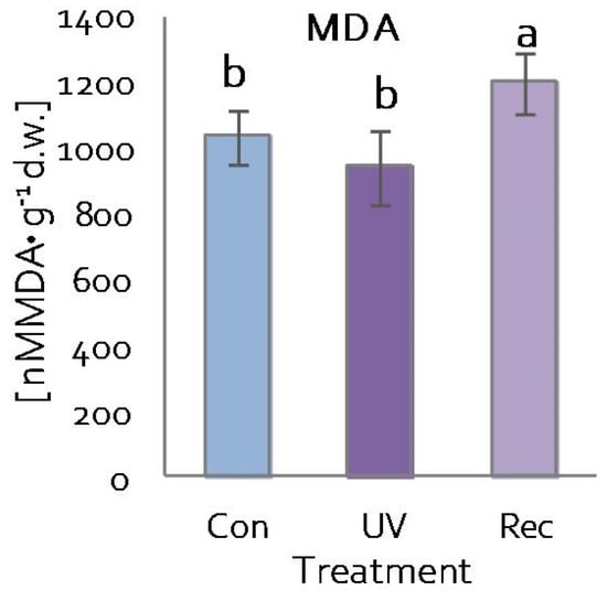 Malondialdehyde (MDA) content in D. muscipula leaves under UV-A treatment; Con—control plants; UV—UV plants; Rec—recovery plants; different letters—statistically significant differences at p ≤ 0.05; n = 5.