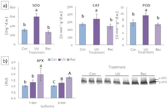Plants, to prevent the overaccumulation of ROS under stress, also developed protective strategies involving enzymatic antioxidants [59,60]. The most common antioxidant enzymes are superoxide dismutase (SOD), catalase (CAT), ascorbic peroxidases (APXs), and other peroxidases [61]. The activities of SOD, CAT and guaiacol peroxidase (POD) were significantly higher in the leaves of UV plants compared to those of control and recovery plants (Figure 7a). In the leaves of recovery plants, the activities of these enzymes were at the same level as in the leaves of control plants (Figure 7a). Among ascorbic peroxidases, two isoforms were identified: thylakoid (t-APX) and peroxisomal (p-APX) (Figure 7b). t-APX content increased in the leaves of recovery plants relative to control and UV plants (Figure 7b), while there was an increase in p-APX content in both the leaves of UV and recovery plants relative to the control, with the increase in recovery plants also being significantly greater compared to UV plants (Figure 7b).