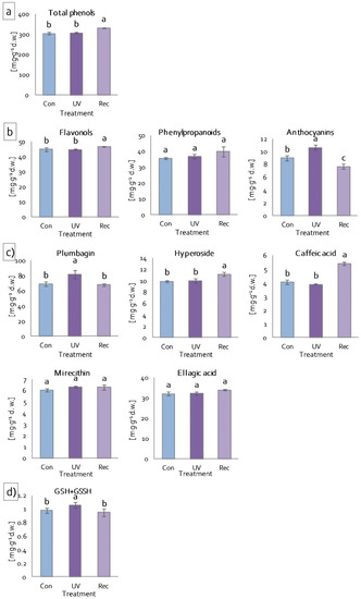Content of low-molecular-weight antioxidants of D. muscipula leaves under UV-A treatment: (a) total phenolic compound; (b) phenolic compound group; (c) specific phenolic compound; (d) total glutathione; Con—control plants; UV—UV plants; Rec—recovery plants; different letters—statistically significant differences at p ≤ 0.05; n = 3.