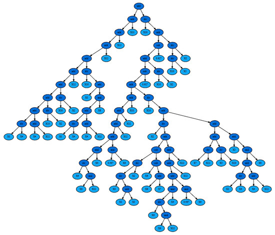 Symbolic Regression tree for age group 1, telomere + arteries experiment (MAE 1.157639). Corresponding expression formula: add(add(add(add(add(add(add(add(add(div(X1, X4), add(X4, X12)), div(X10, X2)), div(X10, X2)), X12), div(X10, add(X3, mul(add(div(X1, X4), add(X4, X12)), X8)))), X12), X12), X11), div(X10, add(sub(add(sub(add(add(add(add(add(mul(div(X6, mul(X6, X12)), X4), mul(0.467, X6)), X12), X12), X11), div(X10, add(div(X2, add(sub(div(div(X0, add(X1, X3)), X2), sub(X6, add(X9, X7))), add(add(add(mul(div(X6, mul(X6, X12)), X4), mul(0.467, X6)), X12), X12))), add(add(div(X7, X12), div(X5, X10)), add(X3, mul(add(div(X1, X4), add(X4, X12)), X8)))))), 0.927), div(X10, X2)), 0.927), div(div(X10, X2), X2)))).