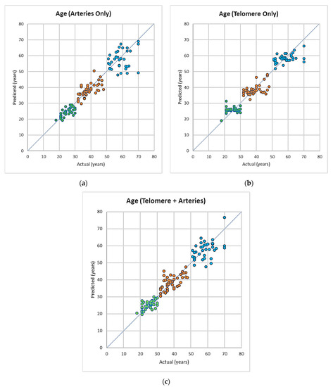 In group 1, the error between predicted versus actual values for age are smallest in the case of using artery measurements only, followed by artery and telomeres, while the largest error occurred when the using telomere only. This difference was overall statistically significant (p = 0.039, and p = 0.045, Table 4a). In group 2, there were no statistically significant differences between MAE using either of predictors p > 0.05, Table 5b). In group 3, where using telomere measurements led to the lowest MAE value, however, this was not statistically significant (p > 0.05, Table 6c).