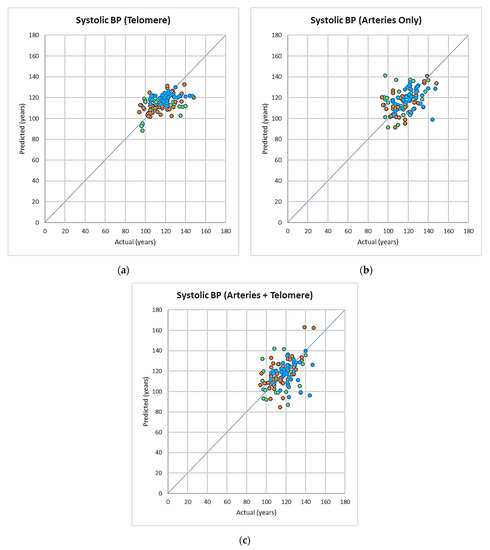 (a–c) Predicted systolic blood pressure vs. actual systolic blood pressure using models based on artery, telomere, artery + telomeres combined data, colour coded for the different age groups (green: 18–30, orange: 31–50, blue: 50+).