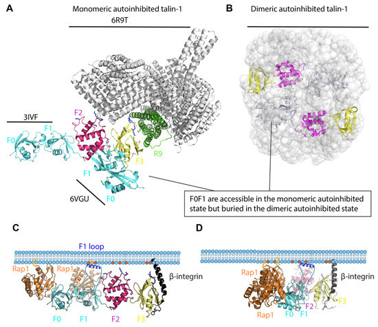 Many proteins are regulated by autoinhibition [39] and talin is no exception, adopting autoinhibited closed conformations [40] mediated by the integrin-binding F3 subdomain binding to the R9 rod domain [41,42]. This autoinhibited talin is predominantly cytosolic in resting cells, and structural insight on this autoinhibition has been revealing. The high-resolution cryo-electron microscopy (cryoEM) structure of a monomeric autoinhibited form of talin-1 was recently solved [43] and is shown in Figure 1A, based on pdb structures 6R9T [43], 3IVF [44] and 6VGU [45]. Talin-1 expressed recombinantly in bacteria is monomeric [43] although the talin-1 extracted from turkey gizzards is dimeric [46]. It is likely that talin can adopt multiple different activation states, a theme that runs through this whole review. Electron microscopy (EM) studies of full-length talin-1 extracted from turkey gizzard indicate that talin-1 forms a compact autoinhibited dimer (Figure 1B) [46]. In the autoinhibited monomeric talin (Figure 1A), the N-terminal F0 and F1 domains are not resolved in the cryo-EM structure of talin-1 [43]. This suggests that the F0F1 double domain module is flexible in autoinhibited monomeric talin. However, structures of the talin FERM domain exist (PDB 3IVF and 6VGU) and in Figure 1A, the F0F1 domains were added in the two different conformations from the separate crystal structures. In both conformations, the F0 and F1 domains are accessible for binding to membrane-bound Rap1, but the F3 domain, which can bind the membrane-proximal NPLF motif in β2, is buried in the globular talin-1 and masked by the R9 subdomain of the talin rod (Figure 1A). The PIP2 binding sites in the F2 and F3 domains are also masked (Figure 1A). In contrast in the structure-based modelling of the dimeric autoinhibited state, the F0 and F1 domains are buried inside the structure and thus not available for Rap1 binding. Similarly, the F2 and F3 domains are also buried, so integrin and membrane phospholipid binding are also occluded (Figure 1B). Clearly there must be activation steps that need to occur that prime the talin molecule for integrin binding and activation.