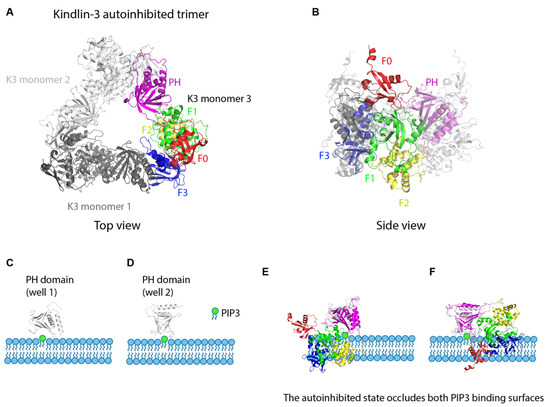 Kindlin-3 is known to be required for β2 integrin activation [62,63,64]. The mechanisms of how integrin activation is regulated by kindlin-3 are not well understood. Like talin-1, kindlin-3 is also a FERM domain-containing cytoplasmic protein with 4 subdomains (F0, F1, F2 and F3) [65]. The F1 domain contains a long flexible loop containing a poly-lysine stretch in the F1 domain [66] and the F2 subdomain has an inserted PH domain. Crystallographic analysis of recombinant kindlin-2 and kindlin-3 with the PH domain and the F1 loop truncation showed the classical clover-leaf conformation of FERM domains [67,68]. Kindlin-2 homodimerization was first observed in a kindlin-2 lacking the PH domain and F1 loop [67]. The dimer formation is mediated by F2-F2 domain interaction and has very slow kinetics [67]. Whether and how kindlin dimerization occurs in cells remains elusive. The PH domain alone was also crystalized at high resolution [69]. Crystallization of full length kindlin-3 revealed that kindlin-3 forms a homotrimer [70]. The F3 domain of kindlin-3 is occluded by the PH domain of a neighboring kindlin-3 protomer (Figure 3A,B). Because the kindlin-3 F3 domain binds the PH domain in homotrimeric kindlin-3, this conformation cannot bind the integrin β chain. The free kindlin PH domain can bind PIP3 in the membrane with 2 different energy minima (“wells”) (Figure 3C,D). However, the autoinhibited homotrimeric kindlin-3 cannot bind PIP3 as both PIP3 binding wells are occluded; i.e., would clash with the membrane (Figure 3E,F).