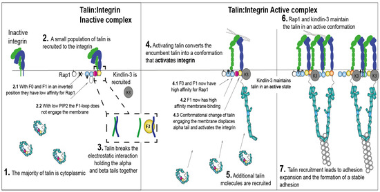 It seems that the F1 loop, and the charged residues in F2 and F3 are also close enough to the plasma membrane to bind the negatively charged PIP2 phospholipids. When bound by talin, the β-integrin tail switches from a 25-degree tilt angle [50] and becomes oriented perpendicular to the plasma membrane (Figure 1C). The two possible conformations of the talin head domain (Figure 1C,D) will be discussed in more detail below.