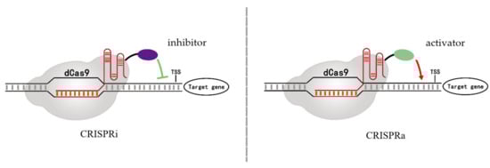 Qi et al. (2013) mutated two conserved endonuclease domains of Cas9 in CRISPR/Cas9 system. The aspartic acid at position 10 of RuvC domain was mutated to alanine (D10A) and histidine at position 840 of HNH domain was mutated to alanine (H840A), so that Cas9 protein lost endonuclease activity and became dead Cas9 (dCas9), which cannot cut DNA but still can bind to specific target DNA sequences with the guide RNA [28]. Therefore, dCas9 binds to the upstream region of the promoter transcription start site (TSS) region and disrupts RNA polymerase or transcription factor binding to the promoter, resulting in inhibition of gene expression without altering the genome. This gene transcription regulation strategy was defined as CRISPR interference (CRISPRi) [29]. The inhibition intensity of CRISPRi system can reach 1000-fold mostly in prokaryotes [30]. CRISPR interference is also widely used in plants such as Nicotiana tabacum, Zea mays, and Arabidopsis thaliana (as shown in Table 1) [31,32,33,34,35,36]. CRISPR interference can be used as an alternative tool for RNAi. Conversely, CRISPR/Cas-derived transcriptional activation (CRISPRa) also can be achieved by dCas9. Bikard et al. (2013) fused the dCas9 protein with ω subgroups (rpoZ) in E. coli, and this dCas9-ω complex increased the reporter gene transcriptional level up to 2.8-fold [37]. The models of CRISPR mediated transcriptional regulation are shown in Figure 2.