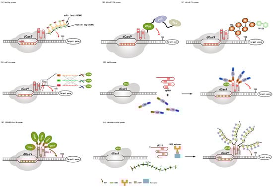 Studies showed that the dCas9 protein fused with the transcription factor VP64 can recruit and stabilize the promoter complex to form dCas9-VP64 [49]. However, dCas9-VP64 is a low-intensity activator with less than 10-fold target gene transcription [32,34,36]. Although higher levels of expression may be desirable to observe more pronounced phenotypes associated with the function of certain genes, these results clearly show that Cas9-based transcription factors can activate endogenous gene expression [50]. Based on this, the researchers attempted to string other different activators together with dCas9 and this resulted in the following three systems: