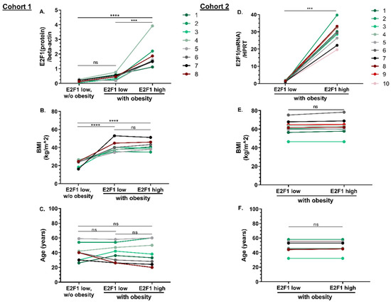Two cohorts of matched patients with high- vs. low-E2F1 levels in VAT. Cohort 1: Human adipose tissue E2F1 protein expression range was determined on a pre-screened cohort of n = 67 persons, and high and low expression were those in the upper and lower two quintiles (40%), respectively. Based on this definition, cohort 1 (Beer-Sheva, Israel), consisted of age, sex, and (when relevant) BMI-matched triplets, each consisting of patients “without obesity and with low-E2F1 expression”, “with obesity and low-E2F1 expression” and “with obesity and high-E2F1 expression”. The matching of eight triplets of patients (i.e., n = 8 × 3 = 24) for E2F1 expression (A), BMI (B), and age (C) is shown. Cohort 2 (Leipzig, Germany) consisted of 10 similarly matched patients, with the following differences: E2F1 expression definition and matching; (D) was based on mRNA expression, and the cohort included pairs only of patients with extreme obesity (BMI ≥ 45 kg/m2) also matched for BMI (E) and age (F). Different colors represent each matched couple/triplet. Dots represent individual patients. *** = Pv < 0.001, **** = Pv < 0.0001, ns = non-significant.