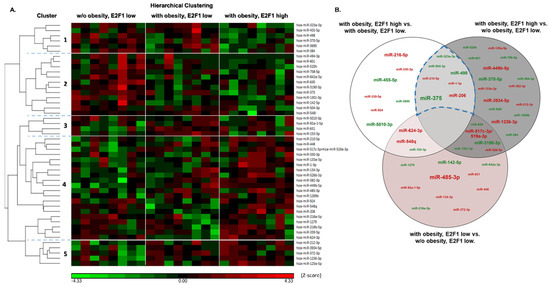miRNAs were isolated from VAT of all (i.e., 3 × 8) 24 participants, and identified using the nCounter® miRNA expression panel. Nanostring© technology provides a hybridization-based, amplification-free direct count of miRNA copy numbers. Overall, 798 miRNAs were identified, out of which 47 (5.7%) were differentially expressed (DE), with a fold change (FC) > 1.25 or <−1.25, p < 0.05, in at least one inter-group comparison (Figure 2). Notably, a heatmap of miRNA expression profiles uncovers miRNAs primarily altered by obesity status (clusters 2 and 5, Figure 2A), being down- and up-regulated, respectively, in patients with obesity compared to those without, regardless of VAT E2F1 expression level. In contrast, other clusters of altered miRNAs exhibited differences primarily associated with E2F1 expression (clusters 1, 3, and 4, Figure 2A). We focused on the seven overlapping VAT miRNAs between the two high/low E2F1 group comparisons, to reflect those that mainly corresponded to differences in E2F1 expression irrespective of obesity (represented by the indicated area in the Venn diagram, Figure 2B). These seven miRNAs included miR-210-5p, miR-206, and its cluster-mate miRNA-1-3p, which were significantly up-regulated in high- versus low- VAT E2F1 samples, while miRNA-375, miRNA-498, miRNA-504-3p, and miRNA-323a-3p were downregulated.