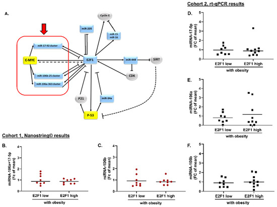 Overall, members of the cancer progression E2F1–miRNA network (miRNA-17-5p and 106a/b clusters, miRNA-15a/b, miRNA-16, miRNA-34a, miRNA-205, and miRNAs-449a/b/c, Figure 3A) were absent from the identified set of VAT miRNAs altered according to E2F1 expression. (Of note, miRNA-449b-5p was elevated in high VAT-E2F1 with obesity as compared to low VAT-E2F1, without obesity. However, this miRNA failed to differentiate between low vs. high VAT-E2F1 among patients with obesity and therefore was not further considered).