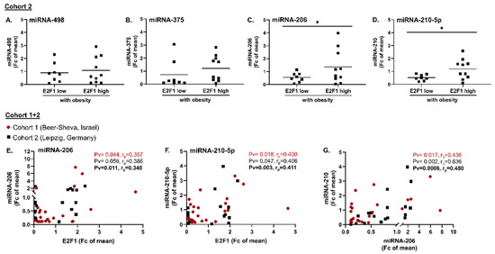 miRNA-206 and miRNA-210-5p intercorrelate and are candidate E2F1 targets. (A–D): Validation of E2F1-related DE miRNAs in human VAT using cohort 2; VAT samples of cohort 2 patients were subjected to miRNA extraction and reverse transcription as described. Expression levels of two down-regulated miRNAs in cohort 1–miR-498 (A) and miR-375 (B), and two up-regulated miRNAs–miRNA-206 (C) and miRNA-210-5p (D) were quantified using RT-qPCR. Comparison of mean miRNA expression in patients with obesity and either low- or high-E2F1 expression was performed using Mann-Whitney non-parametric test. * = Pv < 0.05. (E–G): Inter-correlations of E2F1, miRNA-206, and miRNA-210-5p; miRNA-206 (E) and miRNA-210-5p (F) correlation with adjusted E2F1 expression in human VAT. Intercorrelation between the two miRNAs (G). Shown are data from the two cohorts–cohort 1 participants are depicted in red circles, cohort 2 in black squares. Correlation coefficients (rp) and statistical significance (Pv) for each cohort separately (Cohort 1, Beer-Sheva, Israel in red; Cohort 2, Leipzig, Germany in black) and for the joint cohort (in bold black) were analyzed using Pearson’s correlation test.