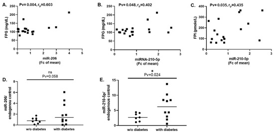 Yet, in cohort 2, in patients with extreme obesity and in whom high-VAT-E2F1 was associated with T2DM, while lipid profile was not associated with miRNA-206 or miRNA-210-5p expression (Table 4), significant correlations were observed between the miRNAs and glycemic parameters (FPG, FPI): miRNA-206 correlated with FPG levels and miR-210-5p correlated with both FPG and fasting plasma insulin (FPI) levels (Table 4, Figure 6A–C, respectively), signifying a systemic glucose-intolerant/insulin-resistant profile. In accordance, by group analysis, those with high-VAT-E2F1 and T2DM exhibited a significantly higher average of miR-210-5p levels (Pv = 0.024), and a nearly significant trend for higher miR-206 levels (Pv = 0.058) (Figure 6D,E).