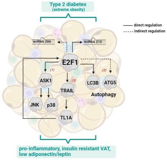 Over recent years, E2F1 has been identified as a molecular hub regulating stress and inflammatory pathways within and around adipocytes in both human and murine adipose tissue [11,12,18]. In obesity, E2F1 is elevated in the adipocyte cell fraction of visceral adipose tissue (VAT) [12]. Traditionally studied as a cell-cycle progression regulator, in the largely quiescent adipocytes, this transcription factor appears to play different roles, driving the expression and activation of stress-activated MAPK cascades [11] and of autophagy genes [12]. In pre-adipocytes, E2F1 acts as an adipogenic stimulator [19] and negatively regulates energy expenditure and mitochondrial activity via the transcriptional regulation of mitochondrial genes [20,21]. Additionally, increased E2F1 expression in human VAT is associated with altered TNF superfamily gene expression, which maintains an inflammatory paracrine loop between adipocytes and immune cells in the tissue [18]. At the whole-body level, E2F1 mRNA expression in human VAT correlates with insulin resistance, circulating IL-6, leptin, and FFA levels [12]. Taken together, E2F1 is an emerging contributor to the endocrine-metabolic dysfunction of adipocytes and adipose tissue.