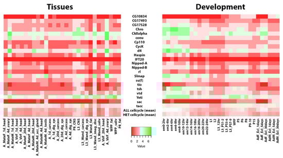 Heatmaps showing expression profiles of the examined single-copy coding genes. Developmental stages (left panel) and tissues expression (right panel). Shades of color from red to green indicate the expression bin classification from 1 (no/extremely low expression) to 7 (very high expression). Developmental stages and tissues expression data were obtained from FlyBase. Tissues (heads, ovaries, testis, carcasses, digestive system, CNS, fat, imaginal discs, and salivary glands) were obtained from different developmental stages, different timing, or different physiological conditions, as indicated (em: embryos; A: adults; L1–L3: larvae 1st–3rd instar; WPP: pupae early stage; P1–P15: late pupae; F/M: females/males; Mate/Vir: Mated/Virgin). “ALL cell cycle:” mean expression of 745 genes whose products are involved in cell division and for which expression data are available from ModEncode and obtained from FlyBase (textual search query “cell division”). “HET cell cycle”: mean expression of 22 heterochromatic genes discussed in this review.