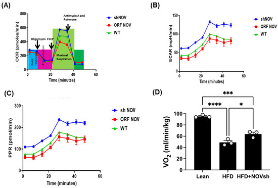 Mitochondrial function and inflammation in adipocytes with the overexpression of NOV (ORF NOV) or NOV knockdown (shNOV) in mice on an HFD. Oxygen consumption rate (OCR) (A), Extra Cellular Acidification Rate (ECAR) (B), and proton production rate (PPR) (C) were measured in differentiated adipocytes with the silencing of NOV (shNOV) or the overexpression of NOV (ORF NOV). Oxygen consumption (VO2) in lean, HFD, and HFD + shNOV mice. (D). Results are means ± SE; * p < 0.05, *** p < 0.001, **** p < 0.0001 by one-way ANOVA followed by multiple comparisons.