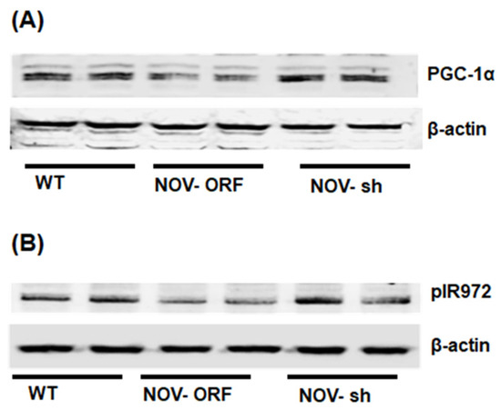 Mitochondrial function, inflammation, and insulin signaling in adipocytes with the overexpression of NOV (ORF NOV) or NOV knockdown (shNOV) in mice on an HFD. Western blot analysis of PGC-1α (A), phosphorylated insulin receptor (pIR972) (B). Results are the average of two experiments run in duplicates.