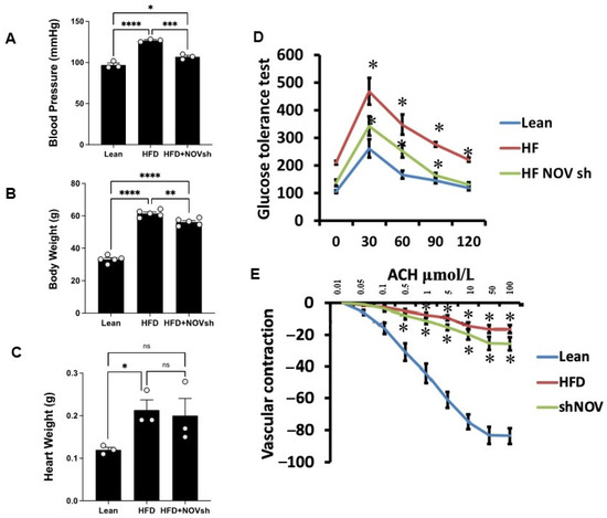 Blood pressure, body weight, heart weight, and glucose tolerance are all improved in shNOV-treated mice (NOV knockdown) on an HFD followed by the activation of PGC-1α, with an improvement in metabolic syndrome. Blood pressure (A), body weight (B), heart weight (C), glucose tolerance (D), and vascular contraction (E), of lean, high-fat, and shNOV-treated mice. Results are means ± SE; * p < 0.05, ** p < 0.01, *** p < 0.001, **** p < 0.0001, ns = not significant.