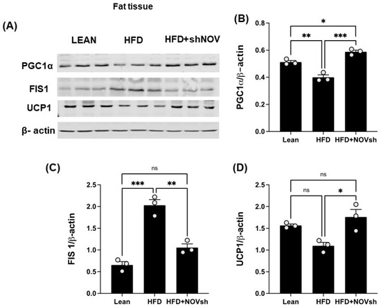 In vivo silencing of NOV with shNOV treatment (NOV knockdown) improves mitochondrial protein levels and metabolic markers in the adipose tissue. Representative western blot of (A): PGC1α (peroxisome proliferator-activated receptor-gamma coactivator), FIS1 (mitochondrial fission 1 protein), and UCP1 (uncoupling protein 1), and corresponding quantifications (B–D) in the adipose tissue of lean, high-fat, and shNOV mice. Results are means ± SE; * p < 0.05, ** p < 0.01, *** p < 0.001, ns = not significant.