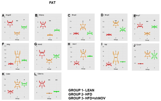 Changes in gene expression in the adipose tissue of shNOV-treated mice (NOV knockdown). RNA-array-analyses changes in the correlation coefficients of gene expression in lean, HFD, and Lnv-adipo-shNOV (HFD) groups. Shown is the mRNA expression (PCR array) of Angiopoietin 2 (Angpt2) (A), adiponectin (Adipoq) (B), Bone Morphogenetic Protein 2 (BMP2) (C), Bone Morphogenetic Protein 4 (BMP4) (D), Bone Morphogenetic Protein 7 (BMP7) (E), Adipogenin (Adig) (F), beta-2-adrenergic receptor (Adrb2) (G), Axin (H), Angiotensinogen (Agt) (I), Cyclin D1 (Ccnd1) (J), Cyclin-Dependent Kinase 4 (Cdk4) (K), and Cyclin-Dependent Kinase Inhibitor 1A (Cdkn1a) (L) in the adipose tissue of lean, high-fat diet (HFD), and shNOV-treated mice. Data are expressed as means ± SE; (n = 5); * p < 0.05, ** p < 0.005 versus lean; # p < 0.05, ## p < 0.005 versus HFD.