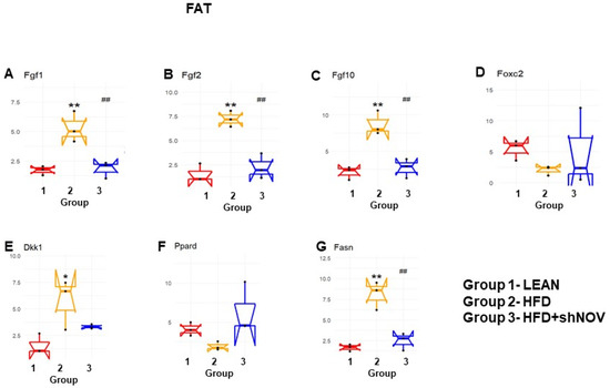 Changes in gene expression in the adipose tissue of shNOV-treated mice (NOV knockdown). RNA-array-analyses changes in the correlation coefficients of gene expression in lean, HFD, and Lnv-adipo-shNOV (HFD) groups. Shown are the mRNA expression (PCR array) Fibroblast growth factors (FGF) 1 (A), FGF 2 (B), FGF 10 (C), Forkhead transcription factor C (FOXC2) (D), Dickkopf-related protein 1 (DKK1) (E), Peroxisome Proliferator-Activated Receptor Delta (PPARD) (F), and fatty acid synthase (FASN) (G) in the adipose tissue of lean, high-fat diet (HFD), and HFD+shNOV mice. Data are expressed as means ± SE; (n = 5); * p < 0.05, ** p < 0.005 versus lean; ## p < 0.005 versus HFD.