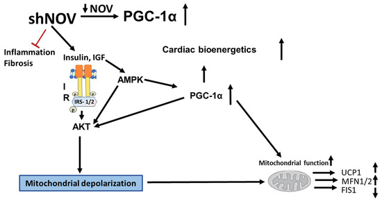 It is well known that insulin resistance and impaired vascular relaxation contribute to cardiac hypertrophy, eventually leading to heart failure [46]. Mitochondrial dysfunction causes oxidative stress, which leads to the development of cardiomyopathy, as demonstrated in PGC-1α KO mice with reduced ATP generation [47]. Furthermore, knocking down PGC-1α aggravates the cardiac hypertrophy induced by aorta constriction [48]. Additionally, the muscle from diabetic patients exhibits reduced levels of PGC-1α and mitochondrial genes [49]. PGC-1α protects the heart by improving adipocyte function and vascular tone; indeed, we have previously demonstrated that a reduction in PGC-1α levels in the visceral fat impairs cardiac function [28,44,50]. Our results suggest an inhibitory interaction between the levels of NOV and PGC-1α: inhibiting NOV upregulated PGC-1α levels in vitro and in obese mice (Figure 2A,B, Figure 7A,B and Figure 9A,B), improving oxygen consumption, upregulating metabolic and mitochondrial markers in the heart, and attenuating heart size. All these observations strongly suggest that the inhibition of NOV can protect the heart against metabolic perturbation and the development of hypertrophy.