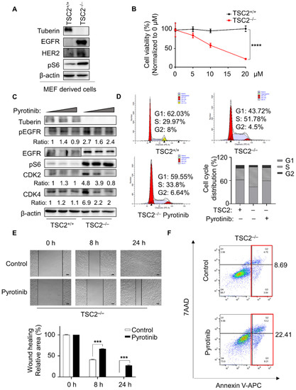 Pyrotinib specifically reduced cellular viability of TSC2-deficient cells. (A) MEF-derived cells with or without TSC2 expression were lysed, and indicated proteins were detected by immunoblot. (B) MEF-derived cells were dealt with different concentrations of pyrotinib for 48 h, and cell viability was monitored using the CCK8 assay (n = 6), the half maximal inhibitory concentration (IC50) was calculated after pyrotinib treatment in TSC2-deficient cells (IC50 = 11.5). **** p < 0.0001, TSC2+/+ versus TSC2−/− at 20 µM, Student t test. (C) Immunoblot analysis of MEF-derived cells treated or not treated with pyrotinib (1 µM or 5 µM). (D) Cell cycle distribution was detected in MEF-derived cells treated with or without pyrotinib (1 µM), fluorescence signals were collected by flow cytometry. (E) TSC2-deficient cells grown to confluent monolayer were scratched and treated with pyrotinib (1 µM) for 8 h and 24 h. Representative images at the 0, 8 and 24 h time points are shown (magnification 40×, bar = 200 µm) *** p < 0.001, control vs. pyrotinib at 8 h or 24 h, Student t test. (F) TSC2-deficient MEF-derived cells were treated with pyrotinib (1 µM) for 48 h. Annexin V: FITC Apoptosis Detection Kit (MULTI SCIENCES) was used to stain cells. Anoikis was determined by flow cytometry. Annexin V+/7AAD+ indicated cells undergoing late apoptosis and Annexin V+/7AAD− indicated early apoptosis.