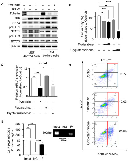 CD24 transcriptional level upregulated by phosphor-STAT3. (A) Indicated proteins were detected in MEF- and LAM-derived cells treated with or without pyrotinib (1 µM). (B) TSC2-deficient MEF-derived cells were treated with fludarabine (0.5 µM or 1 µM) or cryptotanshinone (0.5 µM or 1 µM) for 48 h, CCK8 assay was used to monitor cell viability (n = 5). ** p < 0.01, control versus fludarabine (0.5 µM). *** p < 0.001, control vs. fludarabine (1 µM). ** p < 0.01, control vs. cryptotanshinone (0.5 µM). **** p < 0.0001, control vs. cryptotanshinone (1 µM), Student t test. (C) mRNA expression changes of CD24 was detected by qPCR (n = 3) in TSC2-deficient cells treated with or without pyrotinib (1 µM), fludarabine (1 µM) and cryptotanshinone (1 µM). *** p < 0.001, Control vs. pyrotinib. * p < 0.05, control vs. cryptotanshinone, Student t test. (D) TSC2-deficient MEF-derived cells were treated with fludarabine (1 µM) or cryptotanshinone (1 µM) for 48 h. Cells were stained with the Kit. (E) RT-PCR was performed to determine gene abundance of CD24 promoter region in the groups of positive control (Input), negative control (IgG) and IP, which were immunoprecipitated with anti-pSTAT3 antibody in TSC2-deficient MEF-derived cells. ** p < 0.01, input vs. IgG. **** p < 0.0001, IgG vs. IP, Student t test.