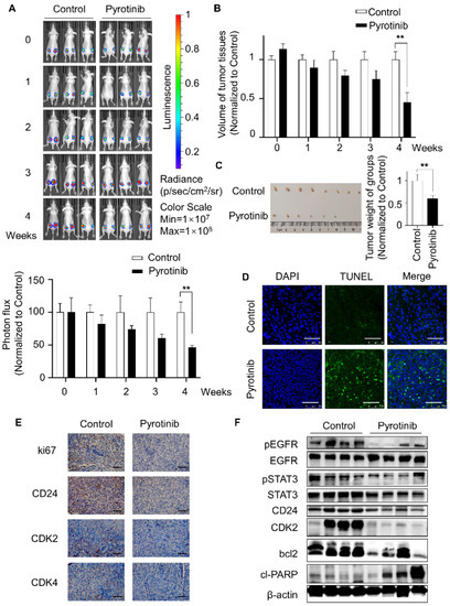 It is a pity that human samples were difficult to acquire because of the rarity of TSC cases. To further confirm the efficiency of pyrotinib in vitro, Balb/c nude mice were selected as experimental animals to construct the mouse xenograft model. Mice were randomly divided into pyrotinib-administered and control groups after subcutaneous tumor-bearing using TSC2-deficient MEF cells. The administration group was given pyrotinib (40 mg/kg/day) by gavage, while the control group was treated with normal saline. The average tumor fluorescence intensity was assessed by bioluminescence imaging (BLI) every week. The results revealed that the fluorescence intensity of the pyrotinib-administered group gradually declined relative to the control group, and there was an obvious difference in the fourth week (Figure 5A). Consistent with this, the tumor volume and weight of pyrotinib-administered group were considerably lower than the control group (Figure 5B,C), and corresponding to this result, the TUNEL assay showed that pyrotinib induced apoptosis of tumor tissue cells (Figure 5D). Pyrotinib inhibited tumor cell viability and induced apoptosis in vitro and in vivo. Immunohistochemical results indicated that Pyrotinib reduced the expression of ki67, CDK2, CDK4 and CD24 (Figure 5E and Figure S5). According to the immunoblotting of tumor tissue, pyrotinib suppressed the pEGFR/pSTAT3 signaling pathway, decreased CD24 protein expression, and produced alterations in apoptosis-related proteins cl-PARP and bcl2, which fully echoed the mechanism of the above in vitro experiments (Figure 5F). Together, pyrotinib inhibited tumor development by inducing apoptosis and suppressing CD24 expression via the pEGFR/pSTAT3 signaling pathway.