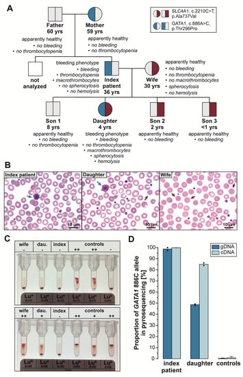 The following supporting information can be downloaded at https://www.mdpi.com/article/10.3390/cells11193071/s1, Supplementary methods: Table S1: Primers used to confirm whole exome sequencing results and screen additional family members via Sanger sequencing; Table S2: Primers used to confirm whole exome sequencing results and screen additional family members via pyrosequencing; Table S3: Primers used for pyrosequencing of X-chromosomal polymorphisms and GATA1 pathogenic variant; Table S4: Primers used for ddPCR analyses of whole blood mRNA. And Supplementary results: Figure S1: Pyrograms of GATA1 c.886A>C p.(Thr296Pro) (exon 6, NM_002049.4); Figure S2: Electropherograms of SLC4A1 c.2210C>T p.(Ala737Val) (exon 17, NM_000342.4) of the index case, his wife and daughter (blue vertical line = base exchange); Figure S3: Flow cytometric analysis of major platelet surface receptors from GATA1 index patient, affected daughter, unaffected wife and additional healthy controls; Table S5: Blood count of the father, mother and son 1. The reference values are given in brackets; Table S6: Transcripts significantly differentially expressed in index case or daughter (overlapping transcripts highlighted in grey).