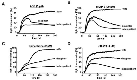 3.5. Platelets from Index Patient and His Daughter Showed Impaired Aggregation in Response to ADP, Epinephrine, TRAP-6, and TxA2 Mimetic U46619, but Normal Surface Expression of Major Receptors