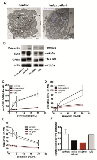 Platelet α- and δ-granule analysis of the GATA1-T296P-variant-affected index patient, his daughter, and his unaffected wife. (A) Transmission electron images of platelets from the index patient and his wife as day control. α-granules are colored in brown, δ-granules are indicated as δ; OCS: surface-connected or open canalicular system, where vacuole compartments are colored in blue. (B) Immunoblotting analysis of P-selectin (CD62P), CD63, and GPIbα in lysates of washed platelets from the index patient, his daughter, his wife, and an additional day control. Actin labeling served as protein loading control. (C,D) Flow cytometric analysis of (C) P-selectin/CD62P and (D) CD63 platelet surface expression in response to the GPVI-agonist convulxin of the index patient, his daughter, his wife, and additional controls (n = 30). (E) Flow cytometric analysis of mepacrine uptake in platelet δ-granules (convulxin 0 µg/mL) and convulxin-induced release convulxin of the index patient, his daughter, his wife, and additional controls (n = 30). (F) Quantification of serotonin in lysates of washed platelets from the index patient, his daughter, his wife, and additional controls (n = 10) by using an ELISA assay.
