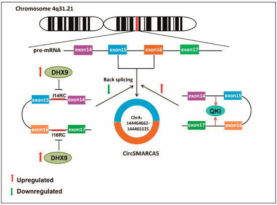 The deregulation of circRNA expression in tumors is a critical molecular mechanism that causes carcinogenesis. CircRNA-002178, for example, is up-regulated in LUAD tissues and LUAD cancer cells, which promotes tumor development [95]; while circRAPGEF5 is markedly down-regulated in renal cells and carcinoma tissues, which inhibits tumor growth [96]. CircRNA abundance is regulated by a variety of mechanisms. Intron complementation primitives (ICSs) can boost circRNA expression by promoting reverse splicing of mRNA precursors. RBPs, on the other hand, can stimulate back splicing by directly bridging distal splice sites and regulating back splicing via binding to ICSs [97]. CircSMARCA5 formation is also governed by several regulatory mechanisms (Figure 1). It has been established that the KH domain containing RNA binding (QKI) and DHX9 play a role in this procedure. QKI is an RBP that induces exon cyclization when it binds to the intron QKI binding motif, which in turn promotes the synthesis of circRNA [98]. As circSMARCA5 is formed, QKI binds to SMARCA5 precursor mRNA downstream of exon 15 and upstream of exon 16 to promote circSMARCA5 synthesis in tumors [99]. As a member of a class of nuclear RNA decapping enzymes, DHX9 can inhibit the formation of circRNAs by binding to their flanking reverse complementary sequences and inhibiting Alu element-induced intron pairing [100,101]. I14RC (reverse complementary sequence in intron 14), as well as I16RC (reverse complementary sequence in intron 16) of SMARCA precursor mRNAs, are the targets of DHX9 action, and overexpression of DHX9 suppresses the synthesis of circSMARCA5 [74]. Additionally, the expression level of circSMARCA5 is inevitably influenced by the transcription activity of its parent gene SMARCA5, which promotes the expression abundance of circSMARCA5 and therefore affects tumor development [102].