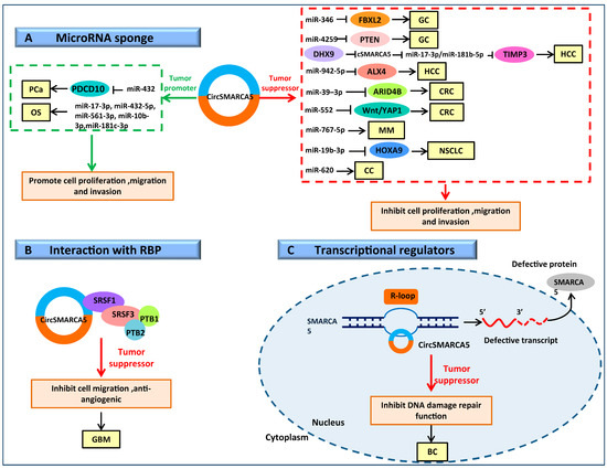 The most intensively studied mechanism of circRNA is that involved in the expression regulation of its miRNA target genes as miRNA sponges by competitively binding to miRNAs, thereby interrupting the interaction between miRNAs and their target genes. Tumorigenesis is greatly impacted by the presence of many miRNA response elements (MREs) on circRNA loop sequences, which affect miRNA-induced gene regulation [2,103]. For example, ciRS-7, which contains more than 70 miR-7 binding sites, impacts the development of several illnesses and tumors by preventing miR-7 from performing its biological [104,105] CircTCF25 interacts with miR-103a and miR-107 to promote the proliferation and migration of bladder cancer cells [19]. Circ-ITCH participates in the development of ovarian cancer by sponging miR-145 [106]. Many studies have shown that circSMARCA5 has multiple miRNA binding sites, functions as a miRNA sponge to regulate the expression of its target genes, and is crucial for the development of various tumors (Figure 2A). For example, in gastric cancer, circSMARCA5 acts as a sponge for miR-346 and miR-4295 and inhibits the proliferation, migration, and invasion of gastric cancer cells [63]. CircSMARCA5 could absorb miR-39-3p and miR-552 to inhibit CRC progression [66,67]. By interacting with miR-620, circSMARCA5 inhibits cervical cancer proliferation and invasion [34]. In NSCLC, circSMARCA5 exerts inhibitory effects on its development via the miR-19b-3p/HOXA9 axis [64]. Through the negative regulation of miR-767-5p levels, circSMARCA5 prevents the growth of multiple myeloma cells in MM [58]. In hepatocellular carcinoma, circSMARCA5 inhibits the growth, migration, and invasive ability of hepatocellular carcinoma cells by sponging miR-17-3p, miR-181b-5p, and miR-942-5p [54,55]. In contrast, circSMARCA5 contributes to the development of prostate cancer by sponging miR-432 [68]. In addition, the CircNet database was utilized by the researchers to evaluate five miRNAs that interact with circSMARCA5 in osteosarcoma. These miRNAs include miR-17-3p, miR-432-5p, miR-561-3p, miR-10b-3p, and miR-181c-3p, however additional studies are needed for validation [33]. Since CircSMARCA5 can regulate some miRNAs with tumor-promoting functions, and some other miRNAs with tumor inhibiting functions, this may explain the dual function of CircSMARCA5 in different tumor types.
