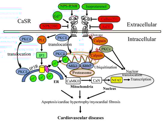 The CaSR-regulated cytosolic and organellar Ca2+ levels activate various pathways, leading to two different endpoints: the sublethal (possibly reversible) or lethal (cell death) changes responsible for subsequent reactions to injury, such as remodeling (i.e., hypertrophy) and repair (i.e., diabetic cardiomyopathy and fibrosis). The disruption of Ca2+ homeostasis contributes to various types of cell death: (a) abnormal ROS production; (b) abnormal cytoskeletal contraction leading to catastrophic cell architecture disorganization; (c) the improper activation of cellular proteases (proteasomes, caspases, calpains, matrix metallopeptidases, etc.), leading to the rapid irreversible degradation of crucial substrates; (d) pore formation in the plasma membrane leading to pyroptosis and necroptosis [27,28,29]. The regulation of the CaSR on these types of cell death has been investigated in cardiovascular and kidney cells, as well as some other cell types [30,31,32]. Thereby, the clarification of the cellular signaling of the CaSR may help to treat cardiovascular diseases in the future. This review focuses on the CaSR-mediated intracellular communication in the non-calcitropic cells of the cardiovascular system and calcitropic kidney cells and the diverse regulation of CaSR signaling in protecting or promoting cardiovascular diseases. We present a general overview of CaSR signaling between the mitochondria, ER, nucleus, lysosome, and proteasomes in related cardiovascular diseases. In addition, the CaSR signaling pathways involved in various common causes of cardiovascular diseases are discussed based on the available data.