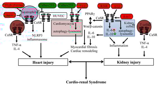 CaSR-mediated signaling in cardiorenal syndrome and heart–kidney interaction. The activation regulator is in red color, and the negative modulator is in green color.