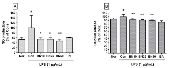 Effect of baicalin on nitric oxide (NO) production (A) and calcium release (B) in RAW 264.7 cells. Values are the mean ± SD of three independent experiments. Nor, normal group incubated with media only; Con, control group treated with 1 µg/mL of lipopolysaccharide (LPS) only; BN10, BN25, and BN50 indicate 10, 25, and 50 µM of baicalin, respectively; IN, indomethacin (0.5 µM); BA, baicalein (25 µM). # p < 0.5 vs. Nor; * p < 0.05 vs. Con; ** p < 0.01 vs. Con.