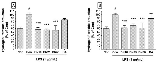 Effect of baicalin treatment of RAW 264.7 cells on hydrogen peroxide production. Macrophages were treated for 24 h (A) and 48 h (B). Values are presented as mean ± SD of three independent experiments. Nor, normal group incubated with media only; Con, control group treated with 1 µg/mL of LPS only; BN10, BN25, and BN50 are 10, 25, and 50 µM of baicalin, respectively; BA, baicalein (25 µM). # p < 0.05 vs. Nor; *** p < 0.001 vs. Con.