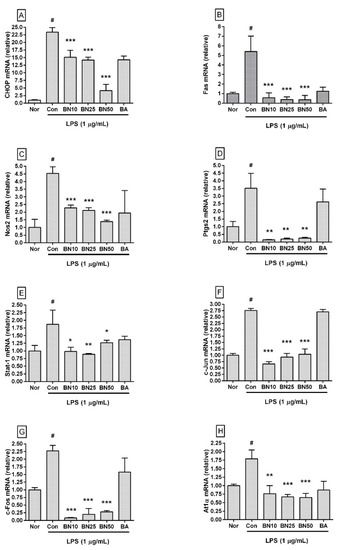 Effect of baicalin on the mRNA expression levels of Chop (A), Fas (B), Nos2 (C), Ptgs2 (D), Stat-1 (E), c-Jun (F), c-Fos (G), and At1α (H) in RAW 264.7 macrophages. Values are presented as the mean ± SD of three independent experiments. Nor, normal group incubated with media only; Con, control group treated with 1 µg/mL of LPS only; BN10, BN25, and BN50 are 10, 25, and 50 µM of baicalin, respectively; BA, baicalein (25 µM). # p < 0.001 vs. Nor; * p < 0.05 vs. Con; ** p < 0.01 vs. Con; *** p < 0.001 vs. Con.