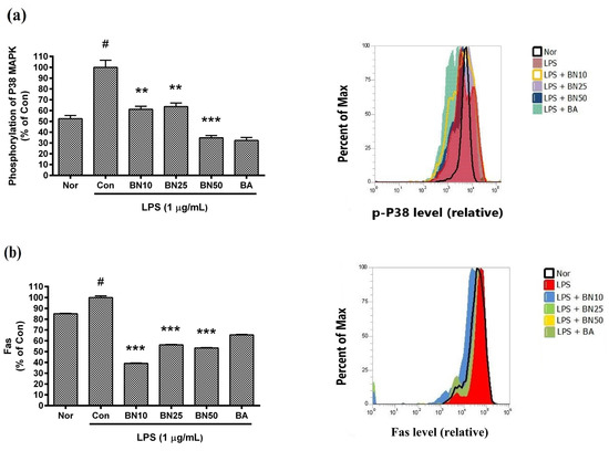 Effect of baicalin on levels of phosphorylated P38 MAPK (a) and Fas (b) in LPS-stimulated RAW 264.7 macrophages. Levels of phosphorylated P38 MAPK and Fas were measured via flow cytometric analysis. Values are presented as mean ± SD of three independent experiments. Nor, normal group (media only); Con, control group (1 µg/mL of LPS alone). BN10, BN25, and BN50 are 10, 25, and 50 µM of baicalin, respectively; BA, baicalein (25 µM). # p < 0.05 vs. Nor; *** p < 0.001 vs. Con; ** p < 0.01 vs. Con.