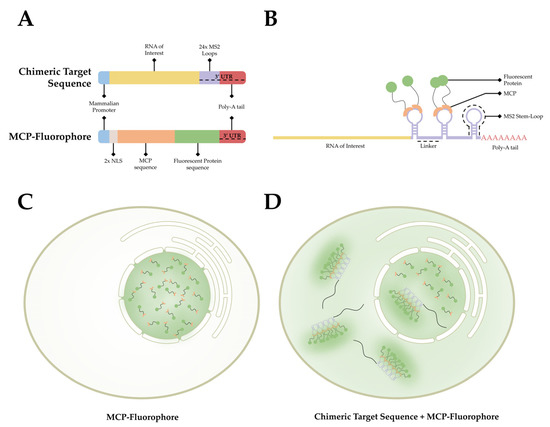 This observed process has provided researchers with a method to label RNA in living organisms. As stem-loop structures do not exist in mammalian cells, MCP does not interact with macromolecules endogenous to mammalian cells. This affords researchers the ability to develop a bipartite labeling methodology, where two plasmids would be introduced to a cell of interest. First, a plasmid containing a mammalian promoter, the sequence encoding for the RNA of interest, and the MS2 loop sequences in the 3′ UTR. Second, a plasmid containing a mammalian promoter, nuclear localization signals (NLS), and the sequence for MCP conjugated with a fluorophore on the 3′ end (Figure 3A). When both plasmids are present and transcribed/translated, an RNA sequence containing MS2 loops at the 3′ end is present, as well as a nuclear-localized MCP-fluorophore. The target sequence and the MCP-Fluorophore then bind with high affinity, creating an MCP-MS2 array that can be localized using light microscopy (Figure 3B). It is important to note that the addition of the NLS to the MCP-Fluorophore enables researchers to ensure that both plasmids are present in the cell, as cells in which fluorescence is only present within the nucleus were lacking the target RNA sequence. This is due to the fact that MCP-Fluorophore binding to mRNA will be exported to the cytoplasm, thereby causing fluorescence, however dim, to be present in the cytoplasm as well as the nucleus (Figure 3C,D).