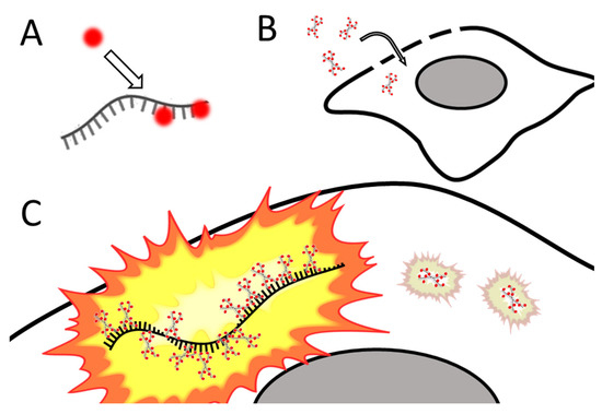 Simplified schematic of MTRIPs. (A) Fluorophores are bound to synthetic oligomers (ligands). (B) Tagged ligands are introduced into the live cell via temporary permeabilization. (C) Ligands bind to target mRNA (not o scale); multiply bound mRNAs are distinguished from unbound probes by intensity. After [123].