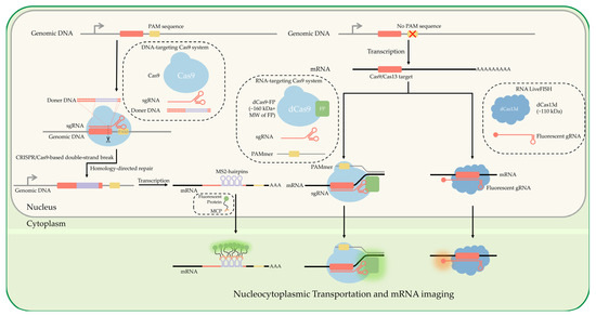Nucleocytoplasmic transportation and mRNA imaging utilizing CRISPR. CRISPR/Cas9 is guided to DNA via sgRNA and neighboring PAM. Nuclease activity of Cas9 makes a double-stranded break, allowing for insertion of targeting aptamers such as MS2 hairpin loops, and for a fluorescent protein fused to MCP to label the modified mRNA. A nuclease deficient Cas (dCas) protein fused with a fluorescent protein can be used to bind to mRNA of interest directly instead, without genetic modification. By providing a double-stranded PAMmer with dCas9, dCas9 can be made to bind with mRNA instead of DNA. Alternatively, dCas13 natively binds to mRNA without the need for PAMmer sequence.
