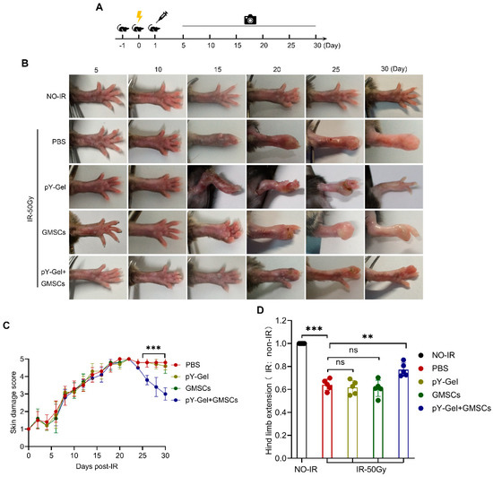 Serial response of mice treated with pY−Gel and GMSCs. (A) The flow chart of the development and treatment of a mouse model of CRI. (B) Representative images of the left hind limb 5–30 days post-irradiation. (C) A 5-point scoring system was used to double-blindly evaluate the degree of skin damage every two days. (D) Assessment of hind limb extension. n = 5 animals. Data are expressed as the mean ± standard deviation. Statistical comparisons were made by ANOVA for multiple comparisons. ns, not significant p > 0.05, ** p < 0.01 and *** p < 0.001.