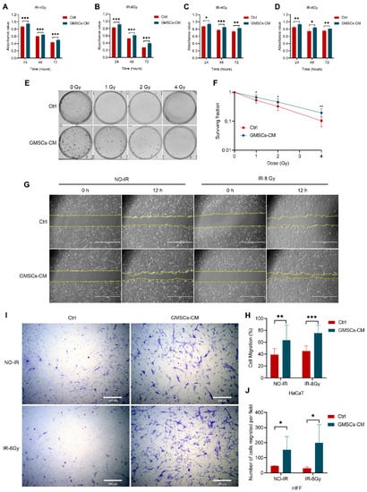 GMSCs promote the proliferation and migration of skin cells. (A,B) CCK-8 assay of HaCaT cell proliferation. (C,D) CCK-8 assay of HFF cell proliferation. (E,F) HaCaT cells were exposed to the indicated IR dose of 0, 1, 2 or 4 Gy and cultured for 10 days. Colonies with more than 50 cells were counted. (G) GMSCs-CM promoted HaCaT cells migration according to the analysis by the scratch wound assay. Scale bars, 1000 μm. (H) Quantitative analysis of the cell migration rates in (G). (I,J) The migration ability of HFF cells treated with GMSCs-CM was measured by the Transwell assay. Representative results from one of three independent experiments are shown. Data are expressed as the mean ± standard deviation. Statistical comparisons were made by a two-sample Student’s t-test, using the SPSS 25.0 software (IBM Corporation, Armonk, NY, USA). * p < 0.05, ** p < 0.01 and *** p < 0.001.