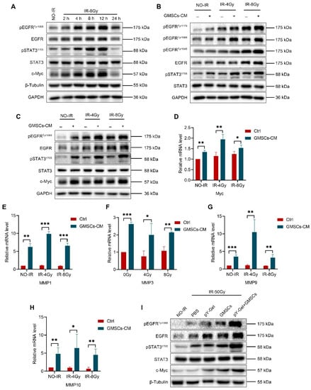 We hypothesized that GMSCs-CM promotes skin cell repair by regulating the activation of EGFR and STAT3. Western blot analysis was used to evaluate the effect of the activation of the EGFR/STAT3 pathway after exposure of skin cells to IR. The results revealed that the protein levels of pEGFR, EGFR, pSTAT3 and c-Myc increased gradually after exposure to IR, and the trend was consistent and time-dependent. The protein levels decreased significantly 24 h after IR, and the trend was the same, but exposure to IR had no significant effect on the total protein level of STAT3 (Figure 5A and Supplementary Figure S3A). Together, these results showed that exposure to IR can induce the activation of the EGFR/STAT3 pathway in skin cells. Thus, we verified whether GMSCs-CM regulates the IR-induced activation of the EGFR/STAT3 signaling pathway in skin cells. The results revealed that the protein levels of pEGFR, EGFR, pSTAT3 and c-Myc were increased in HaCaT cells after exposure to IR and significantly elevated in the GMSCS-CM-treated HaCaT cells compared with the untreated control HaCaT cells (Figure 5B,C and Supplementary Figure S3B,C). Furthermore, the expression level of Myc in the GMSCs-CM-treated HaCaT cells was also significantly increased compared with the untreated control cells (Figure 5D). We also tested the effects of GMSCs-CM treatment on the expression of downstream target genes of EGFR/STAT3 in HaCaT cells after exposure to IR. Matrix metalloproteinases (MMPs) are related to angiogenesis and cell migration mechanisms and are known to be an important part of epithelial repair [53]. Our results revealed significantly increased expression levels of the target genes MMP1, MMP3, MMP9 and MMP10 (Figure 5E–H) in the GMSCs-CM-treated cells compared with the untreated control cells. These results suggest that GMSCS-CM regulates the IR-induced activation of the EGFR/STAT3 signaling pathway in skin cells. We further verified whether GMSCs regulate the IR-induced activation of the EGFR/STAT3 signaling pathway in skin tissue. The results showed that the protein levels of pEGFR, EGFR, pSTAT3 and c-Myc were increased in irradiated skin tissues compared with the non-irradiated tissues. Compared with the other groups, the phosphorylated protein levels in the pY-Gel+ GMSCs group were significantly increased (Figure 5I and Supplementary Figure S3D). These results indicated that treatment with pY-Gel-encapsulated GMSCs regulates the IR-induced activation of the EGFR/STAT3 signaling pathway in skin tissues.