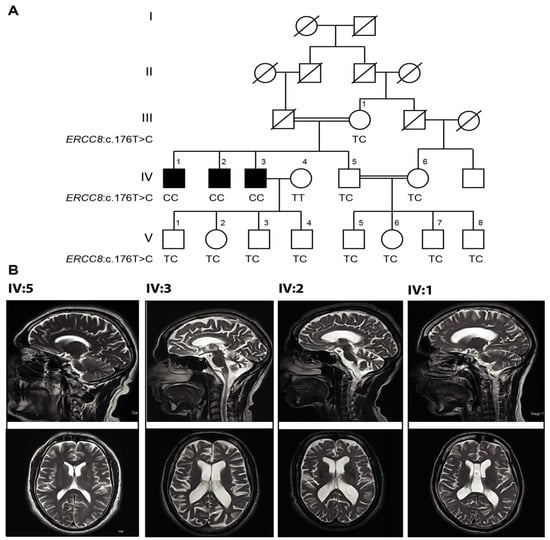 Pedigree, genotypes, and MRIs of the consanguineous family segregating the ERCC8 variant. (A) Pedigree and genotypes of the family segregating ERCC8 mutation c.176T>C. Squares and circles indicate males and females, respectively. The symbols in black filled represent the affected members. The symbol with a diagonal line indicates a deceased individual. The numbers to the left of pedigree show generation number while those above the symbols denote individuals within that generation. (B) T2-weighted brain MRI of the normal brother (IV:5) shows a healthy cerebellum. Patient (IV:3) has prominent cerebellar atrophy/degeneration (upper panel) and prominent intra and extra cerebral CSF spaces (lower panel) shown on axial section of T2-weighted image. Affected brother (IV:2) has prominent cerebellar atrophy/degeneration (upper panel) and mildly dilated intra and extra cerebral CSF spaces (lower panel) shown on axial section of T2-weighted image. Affected brother (IV:1) has very mild atrophy/degeneration of cerebellar folia (upper panel) on axial section of T2-weighted image.