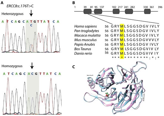 Analysis of the ERCC8M59T variant and its 3D structure modeling. (A) Chromatograms of DNA sequence of healthy carrier IV:5 (top) indicates heterozygous for the variant, and affected individual IV:1 (bottom) indicates a homozygous missense mutation in ERCC8 gene. Arrows indicate the position of the c.176T>C, which resulted in substitution of Methionine (Met, M) to Threonine (Thr, T) at codon 59 (p.M59T). (B) Degree of conservation of the Met 59 residue (shaded) across different species. (C) Visual comparison of predicted models. ERCC8WT is shown in pink color ribbons, while ERCC8M59T is shown in sky blue color. The regions with conformational changes are labelled in black. Position of M59 is shown green in WT, while red in mutant structure.