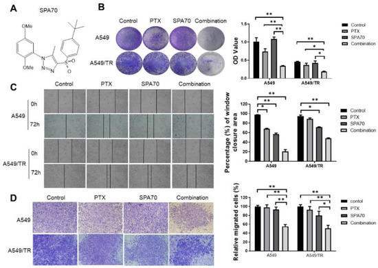 The effect of PTX, SPA70 and combination treatment on the cell colony formation and migration, invasion effects of PTX, SPA70 and combination on A549, A549/TR cells. (A) Chemical structure of SPA70. (B) Representative images from the colony formation assay, and the quantification of the results from A549, A549/TR. The experiment was conducted using 1 nM PTX, 5 ΞΌM SPA70 in 12-well plates with triplicates. Colonies were lysed in buffer with SDS and read the absorbance at 490 nm. Quantification was applied to show relative cell viability. One-way ANOVA test was performed for statistical significance. *, p < 0.05; **, p < 0.01, compared with indicated groups. (C) Wound healing assay was carried out in 12-well plates with triplicates and the photo was taken after drugs were added for 72 h. The drug concentration was 2 nM PTX and/or 10 ΞΌM SPA70. The migrated cells that crossed the scratch line were quantified and displayed as percentage of total wound closure area. One-way ANOVA test was performed for statistical significance. *, p < 0.05; **, p < 0.01, compared with indicated groups. The photographs were taken by microscopy (200Γ). (D) 2 nM PTX and/or 10 ΞΌM SPA70 were treated for 48 h and pictures were taken from the opposite side of the Matrigel-coated surface, which indicates the invaded cells to the lower chamber. The photographs were taken by microscopy (200Γ). Quantification was applied to show cell invasion. One-way ANOVA test was performed for statistical significance. *, p < 0.05; **, p < 0.01, compared with indicated groups.